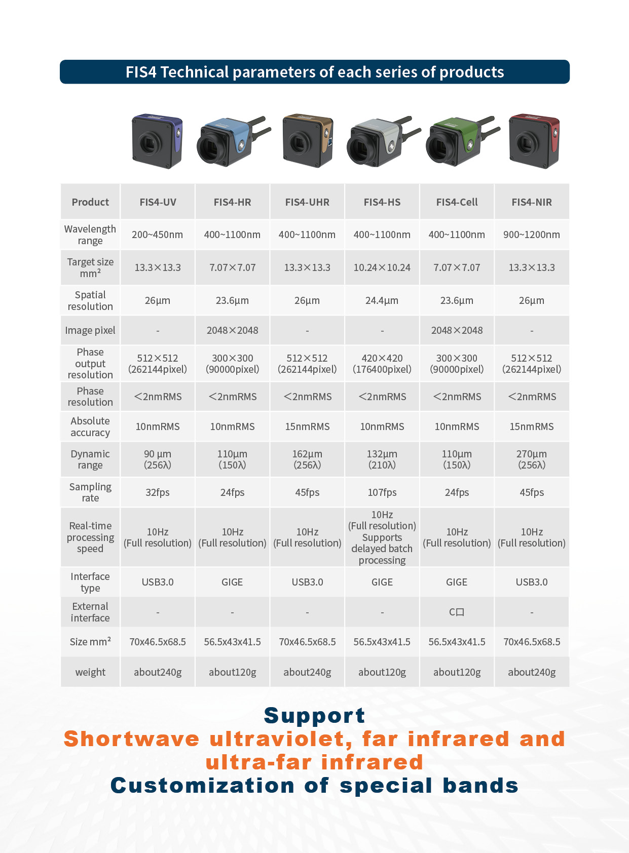 Specielt udviklet til bølgefrontanalyse i højhastighedsindustri-, forsvars- og videnskabelige forskningsscenarier såsom flyvende skud og flowfelter, den har en ultrahøj opløsning på 420×420 (176400) fasepunkter, en bredspektret respons på 400-1100nm, og 107 rammer med højhastighedssampling, der giver et ideelt bølgefrontsfølende måleværktøj til waferoverfladen ruhedsdetektion, siliciumbaseret og glassubstratmikromorfologimåling, aerodynamisk optik, højhastighedsflowfelt, gasplasmadensitetsmåling osv.